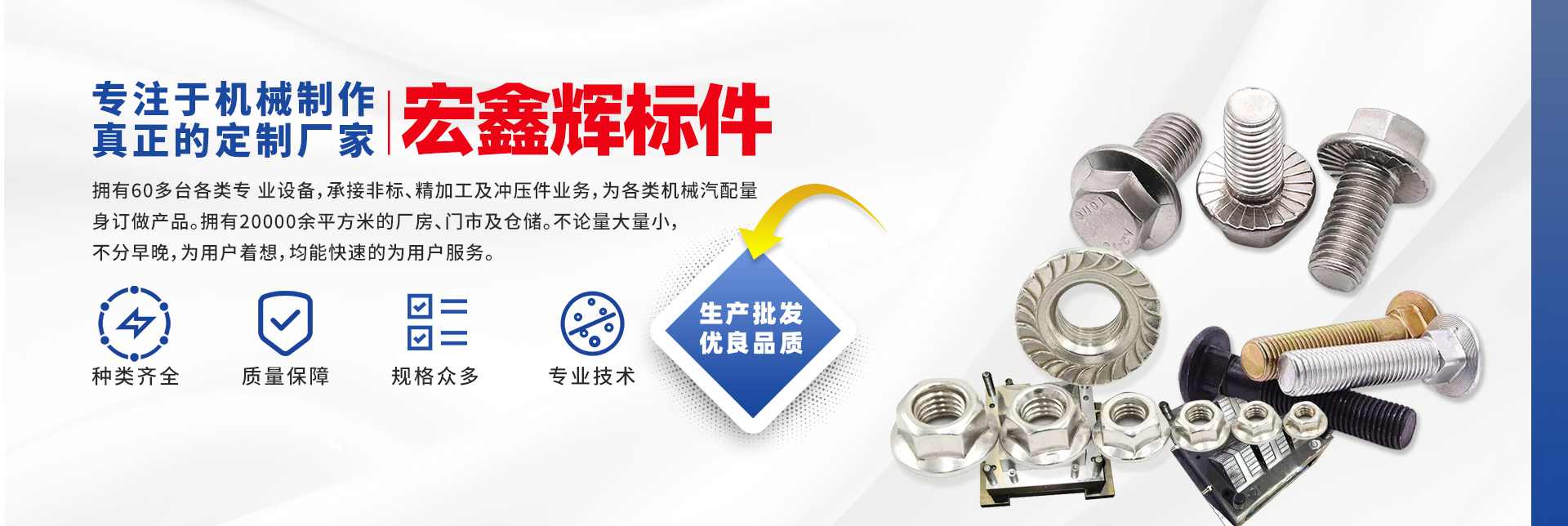 四川宏鑫輝標準件制造有限公司下設:南充市宏輝機械制造有限公司,南充市聚宏機電設備有限公司,公司始建于1994年。為了拓展市場,降低成本,本公司于2007年、2020年分別在南充、 成都、重慶創建了生產基地。擁有60多臺各類專 業設備,承接非標、精加工及沖壓件業務,為各 類機械汽配量身訂做產品。擁有20000余平方米的廠房、門市及倉儲。公司以誠信為本,竭誠為廣大客戶提供服務。不論量大量小,不分早晚,為用戶著想,均能快速的為用戶服務。 公司所生產及代理的產品為業界人士公認的國內、國際優等品牌。在產品性能與質量